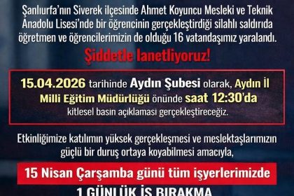 Büyütmek için resme tıklayın Şanlıurfa’daki silahlı saldırı sonrası eğitim sendikaları grev kararı aldı. Türk Eğitim-Sen Aydın Şubesi iş bırakma eylemi başlattı. Karar kapsamında sendika üyesi ö...