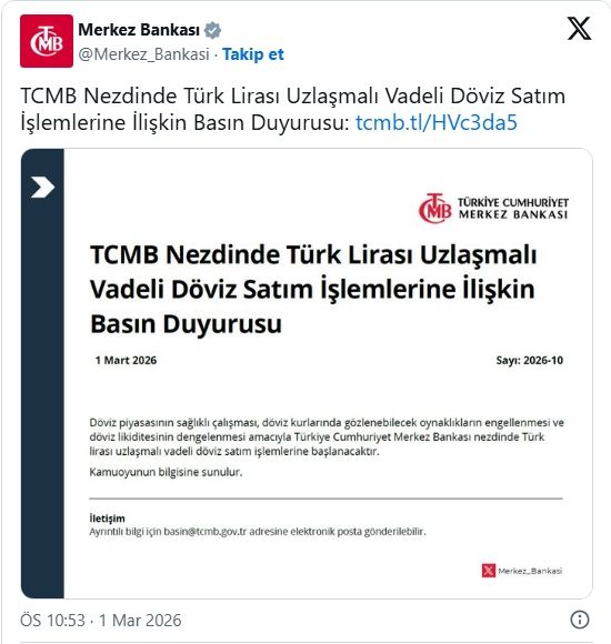 İkinci kritik adım ise doğrudan döviz kurlarına yönelik oldu. Savaş haberiyle artan döviz talebi frenlenecek. TCMB, döviz piyasasının sağlıklı çalışması için yeni işlemi devreye soktu. Kurlardaki oynaklığı engellemek ve likiditeyi dengelemek amacıyla Türk lirası uzlaşmalı vadeli döviz satım işlemlerine başlanacağı ilan edildi.