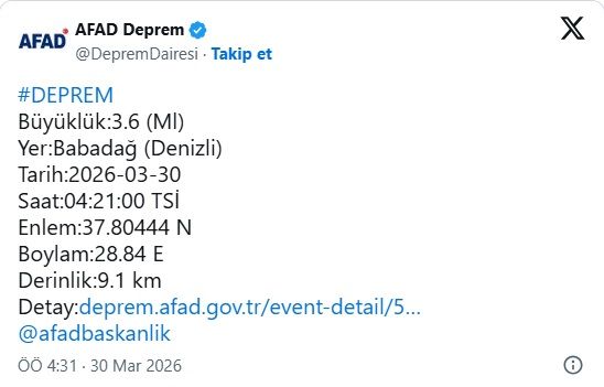 Afet ve Acil Durum Yönetimi Başkanlığı ( AFAD) verilerine göre, Denizli’nin Babadağ ilçesinde saat 04.21 sularında deprem meydana geldi. Yerin 9 kilometre derinliğinde kaydedilen sarsıntı, bölge halkına uykuda yakalandı.